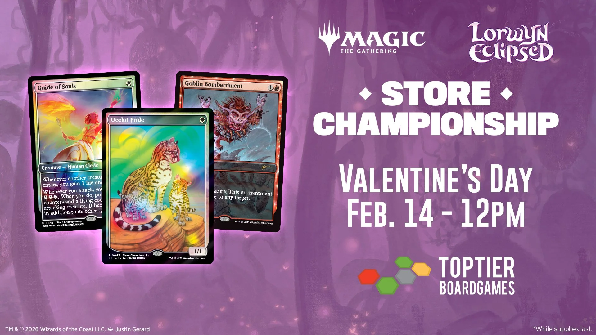 Join us for the Store Championship at Top Tier Board Games! $15 gets you entry to our Standard tournament with Swiss rounds and a top cut based on attendance (see note below about top cut). Each participant will receive a promo Golbin Bombardment just for playing, while top 8 takes home both a foil and non-foil Guide of Souls, and the winner receives a foil and one-of-a-kind non-foil Ocelot Pride. Why are they so special? Top 8 and Winner non-foil promos will have Top Tier Board Games printed on them - you can't get these anywhere else!