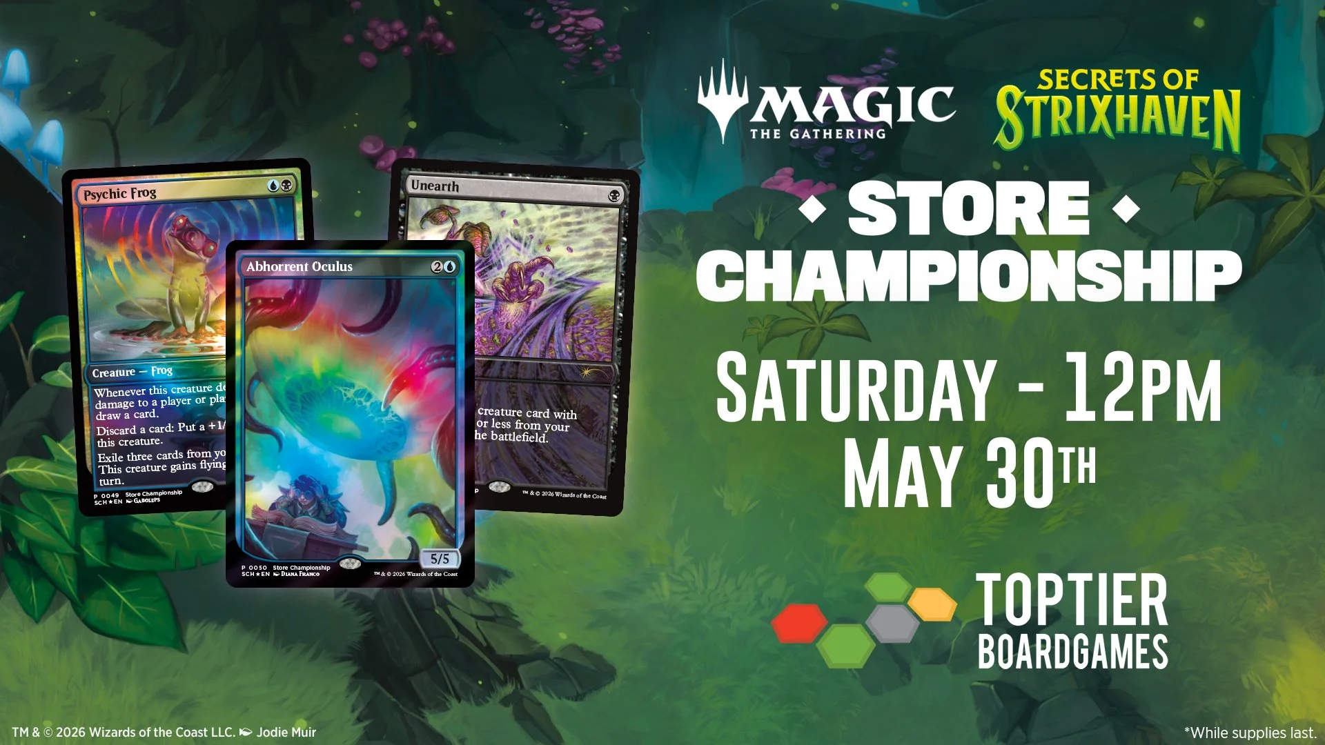 Join us for the Store Championship at Top Tier Board Games! $15 gets you entry to our Standard tournament with Swiss rounds and a top cut based on attendance (see note below about top cut). Each participant will receive a promo Unearth just for playing, while top 8 takes home both a foil and non-foil Psychic Frog, and the winner receives a foil and one-of-a-kind non-foil Abhorrent Oculus. Why are they so special? Top 8 and Winner non-foil promos will have Top Tier Board Games printed on them - you can't get these anywhere else!