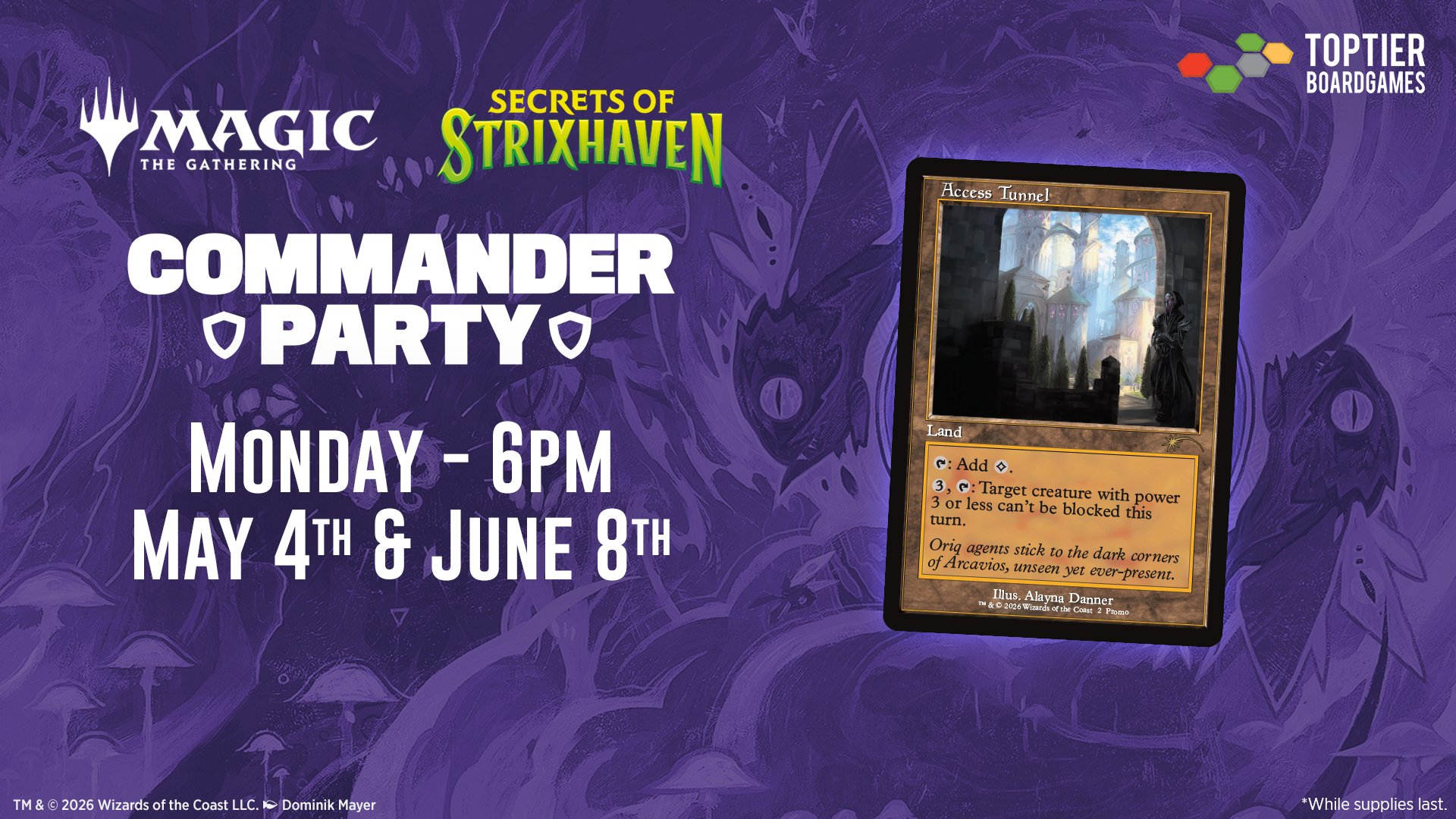During our Secrets of Strixhaven Commander Parties, participants will receive a promo Access Tunnel!